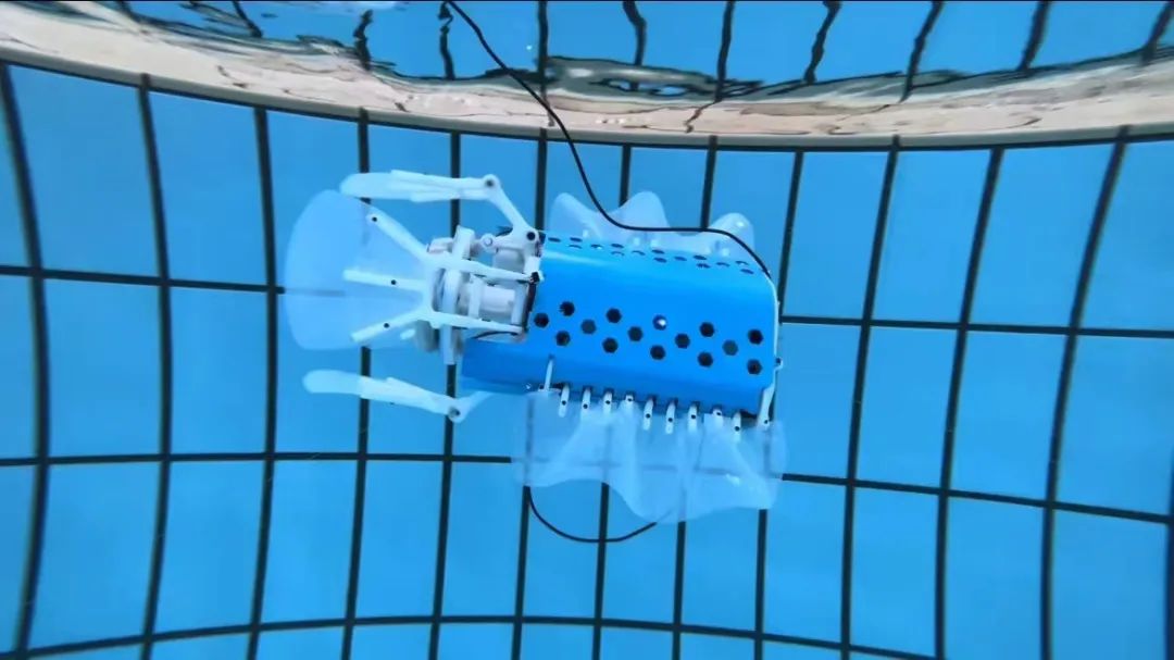 针对现有仿生水下机器人的速度缓慢难以加速的缺点,仿生幽灵蛸的腕翼结构,设计尾部加速机构,解决速度缓慢无法加速的问题。